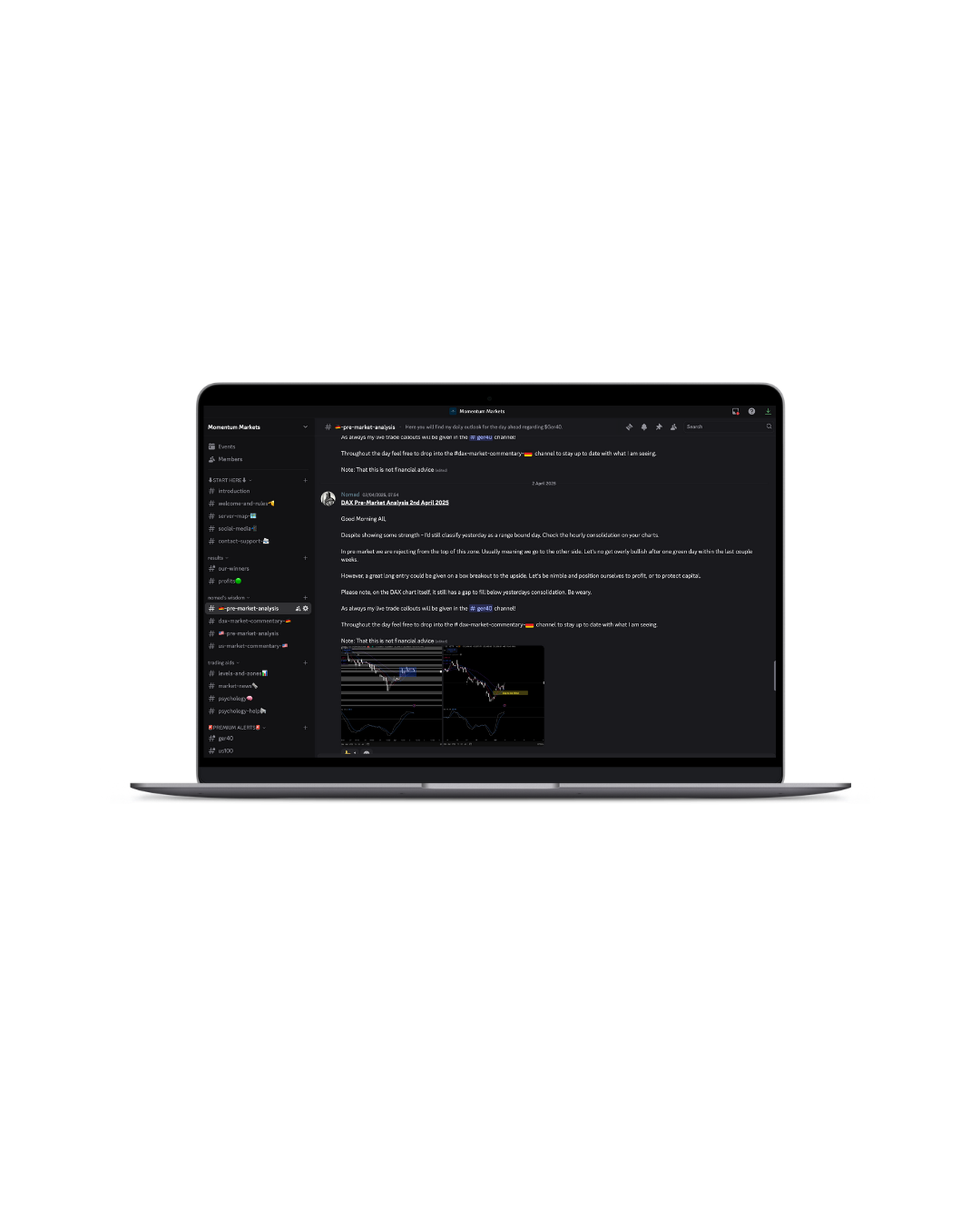 Take a look inside our premium Discord server—packed with trade breakdowns, market insights, and 1-on-1 chats with funded traders. Whether you’re refining your edge or still finding it, Momentum gives you the tools, feedback, and focus to grow fast.
